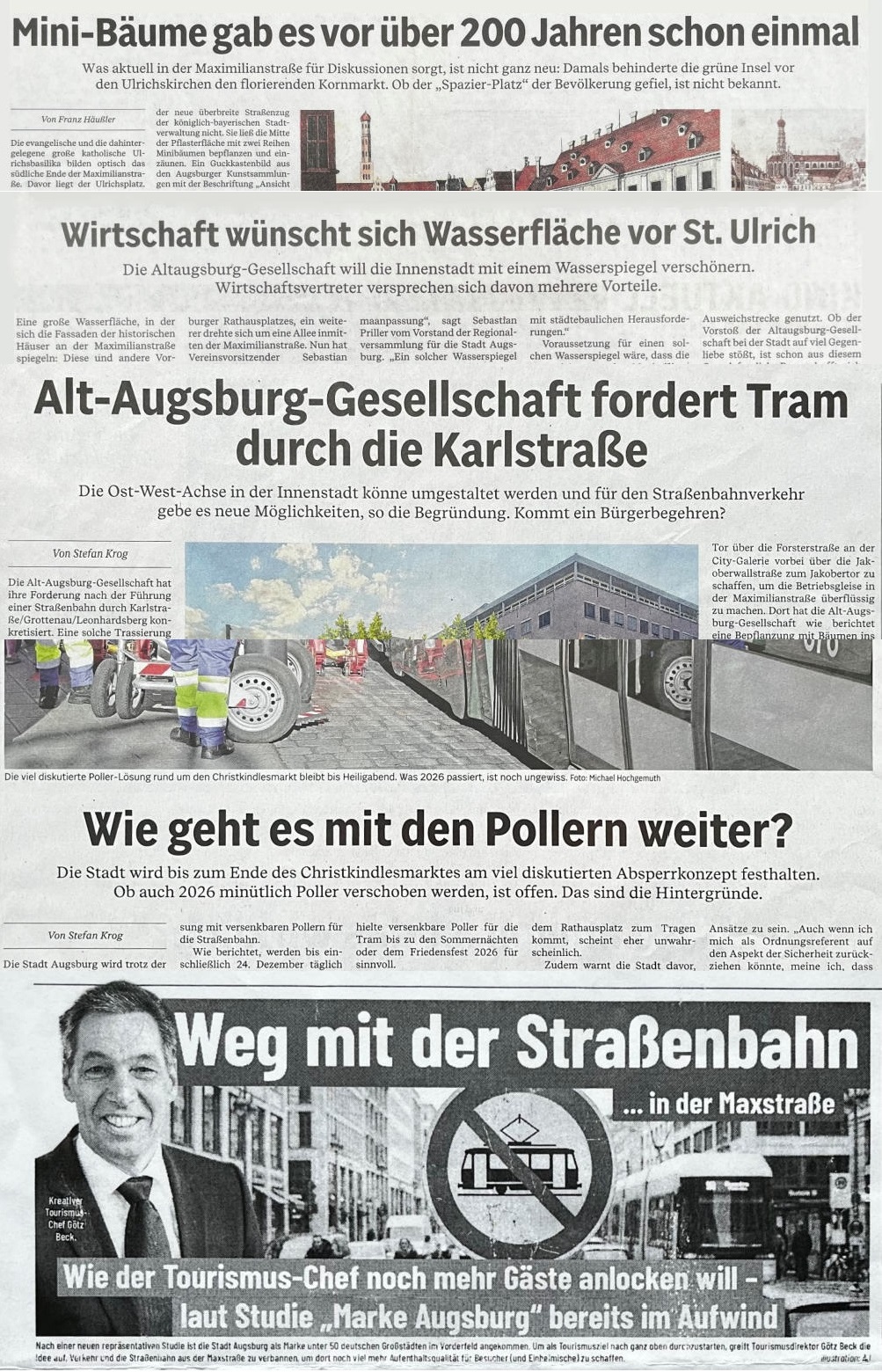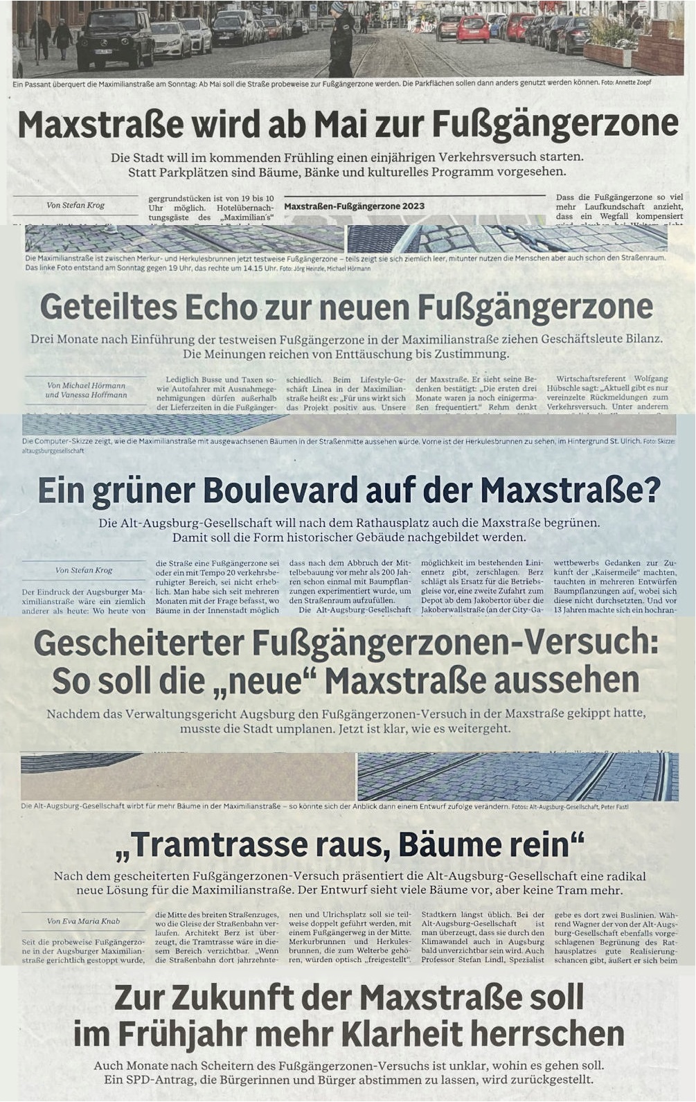 Für einen wirksamen Umbau muss sich Augsburg ehrlich machen und neue Strategien entwickeln, die weit über die aktuellen Projekte hinaus reichen. Fuggerstraße, Rathausplatz, Maximilianstraße und Bahnhofsplatz sind die Leuchttürme einer Gesamtmaßnahme, die dazu beitragen soll, Augsburg attraktiv und lebenswert zu erhalten. Das Begehren „7000 Bäume“ soll diese Erkenntnis im Sinne aktiver Bürgerbeteiligung unterstützen.